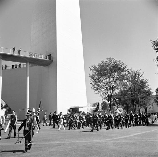 [Procession in front of the Perisphere, Helicline and Trylon at the New York World's Fair.]