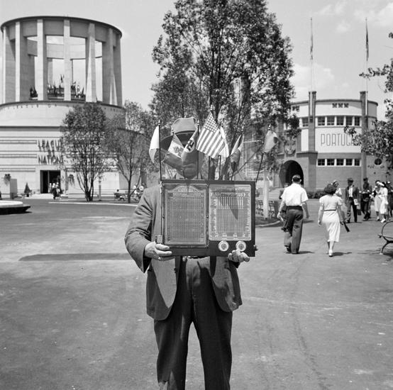 [Man holding universal calendar near the Venezuela pavilion, Government Zone, New York World's Fair.]