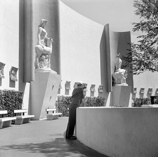 [Man looking at a statue inside the Portuguese pavilion, New York World's Fair.]
