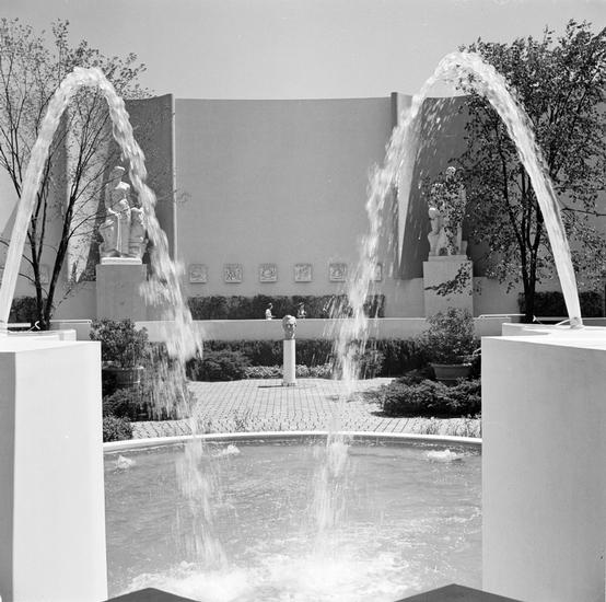 [New York World's Fair Administration building with "Mithrana" sculpture.]