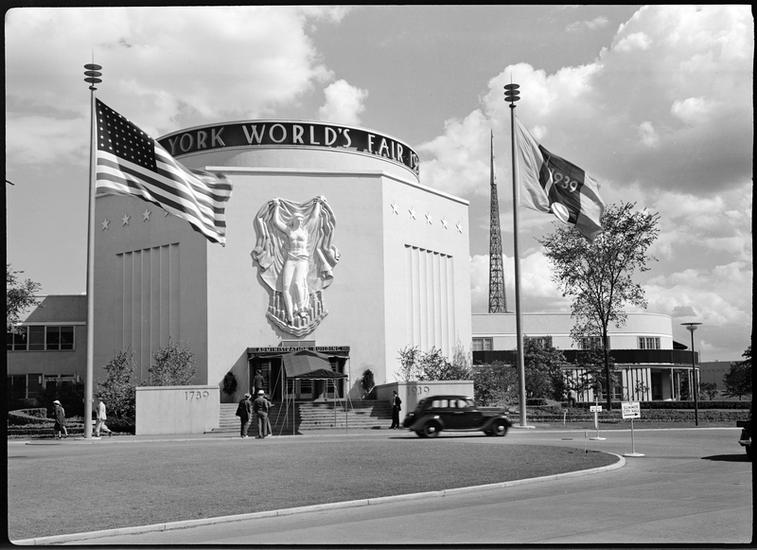 [New York World's Fair Administration building with "Mithrana" sculpture.]