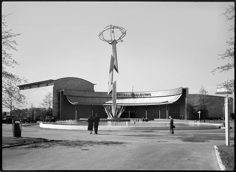 [Lightning bolt sculpture in front of General Electric building, New York World's Fair.]