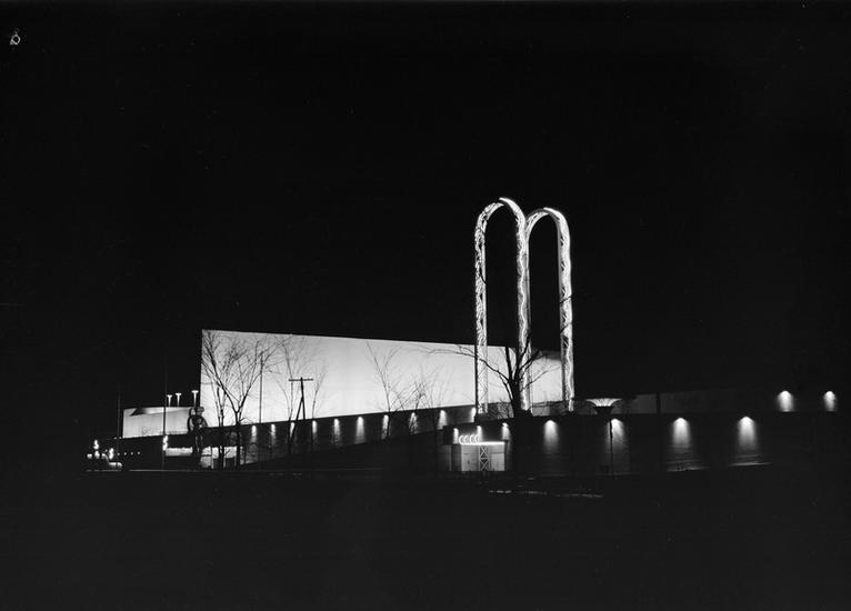 [Night view of the Glass Inc. building, New York World's Fair.]