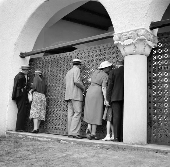 [Upside-down, reflected view of people at the New York World's Fair.]