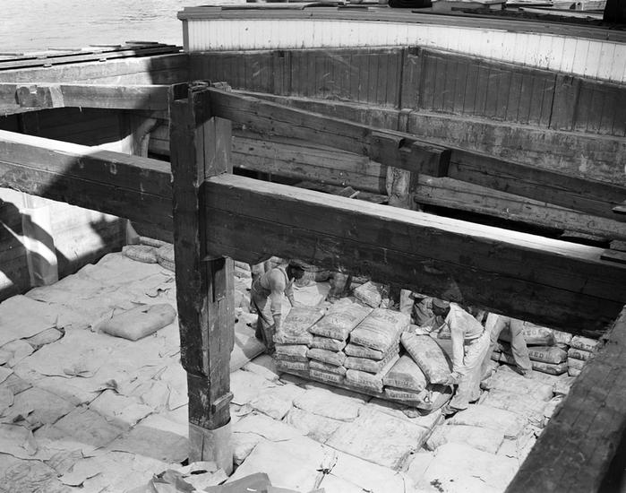 [Workers unloading boat.]