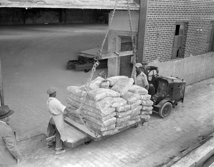 [Men unloading cargo at New York State Canal Terminal in Mott Haven.]