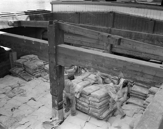 [Men unloading cargo at New York State Canal Terminal in Mott Haven.]