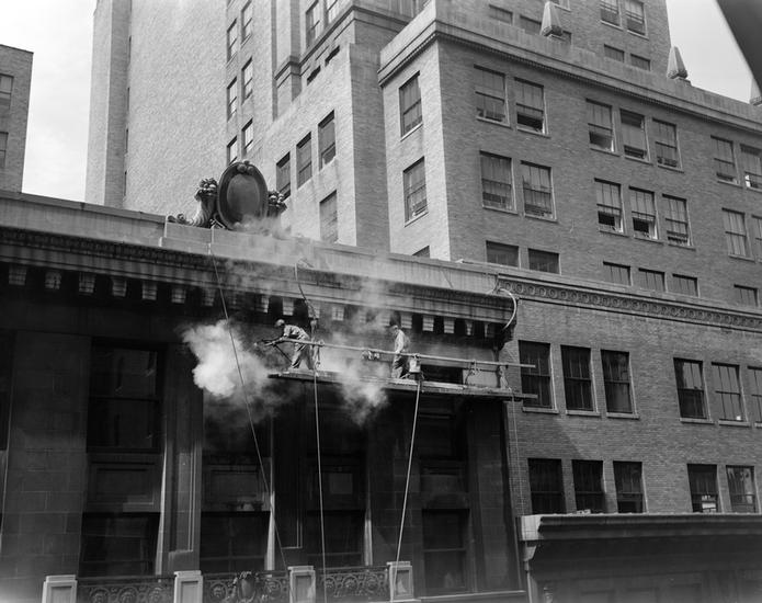 [Steam cleaning the exterior of the Equitable Life Insurance Company building.]