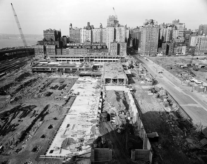 [Railyard and construction of Lincoln Towers apartment complex.]