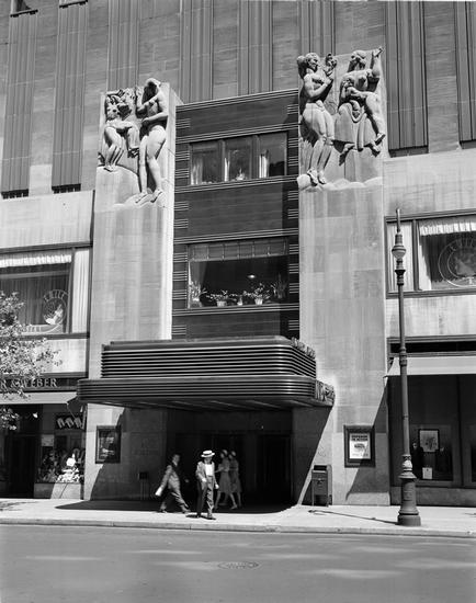 ["The Spirit of Progress" limestone panel by Gaston Lachaise on the entrance pier of the RCA Building West.]
