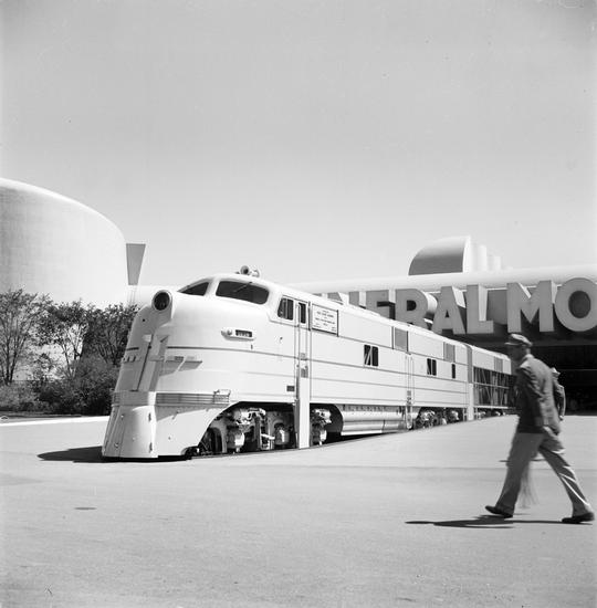 [Diesel passenger locomotive in front of the General Motors building at the New York World's Fair.]
