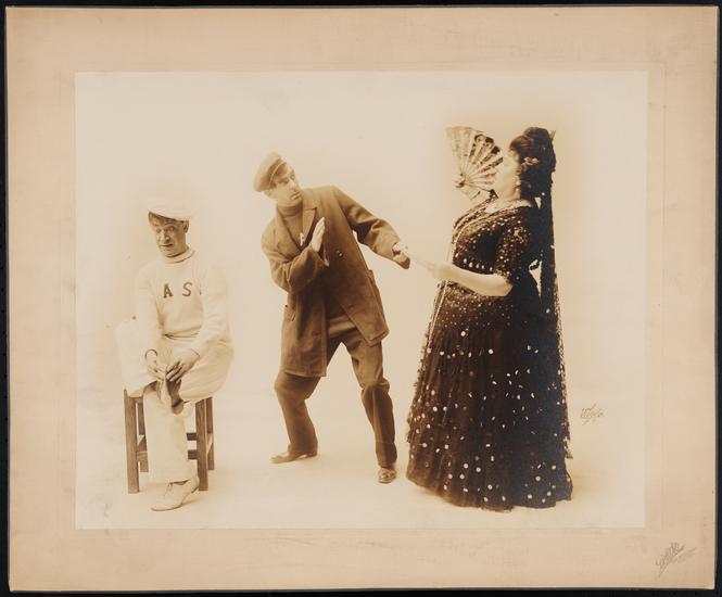[Frances Cameron as Honorka, James T. Powers as Polycarp Ivanovitch and Leila Hughes as Tatjana in "Two Little Brides".]