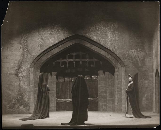 [Evelyn Walsh Hall as Queen Elizabeth with her ladies of the court in "King Richard III".]