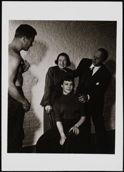 [Janice Rule as Madge Owens, Peggy Conklin as Flo Owens, Kim Stanley as Millie Owens and Ralph Meeker as Hal Carter in "Picnic".]