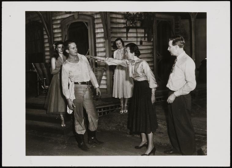 [Janice Rule as Madge Owens, Peggy Conklin as Flo Owens, Kim Stanley as Millie Owens and Ralph Meeker as Hal Carter in "Picnic".]