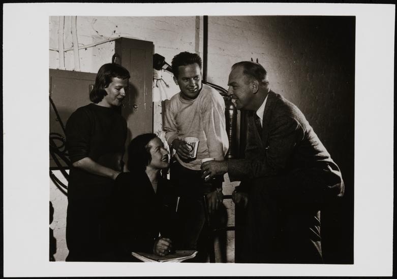 [Janice Rule as Madge Owens, Peggy Conklin as Flo Owens, Kim Stanley as Millie Owens and Ralph Meeker as Hal Carter in "Picnic".]