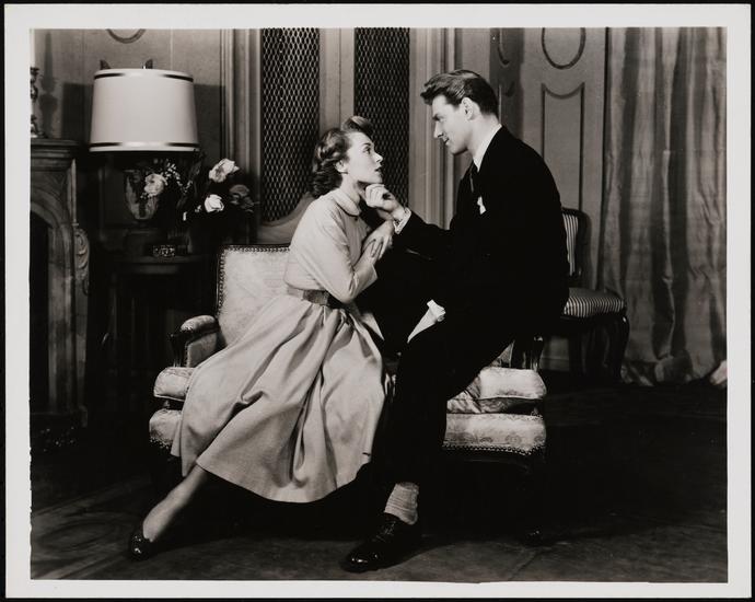 [Faye Emerson as Lucile Miremont and Jean-Pierre Aumont as Henri or Pierre Belcourt in "The Heavenly Twins".]