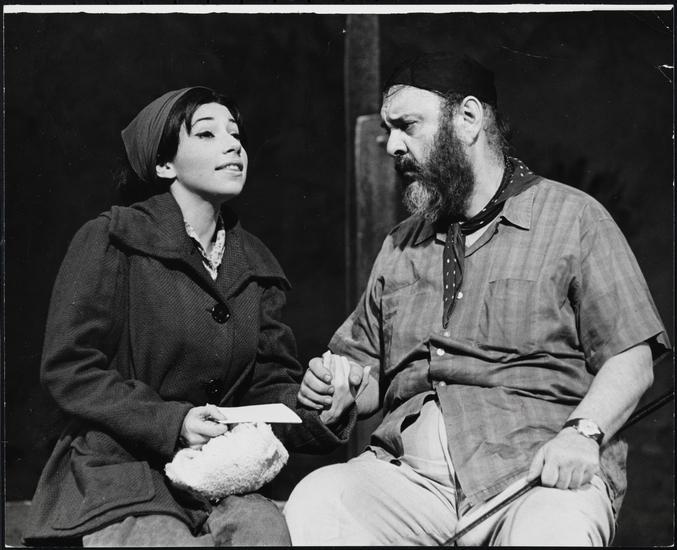 [Zero Mostel as Tevye, Julia Migenes as Hodel and Maria Karnilova as Golde in "Fiddler on the Roof".]