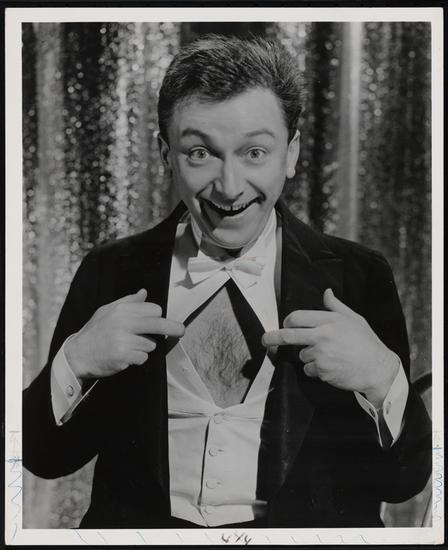 [Ross Parker as The Late Diner and Robert Dhery as The Waiter performing the "In a Small Cafe" number in "La Plume de Ma Tante".]