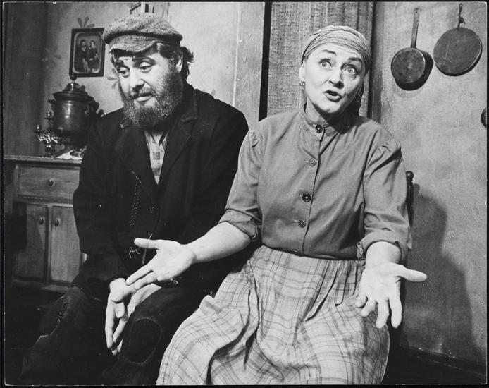 [Zero Mostel as Tevye and Maria Karnilova as Golde in "Fiddler on the Roof".]