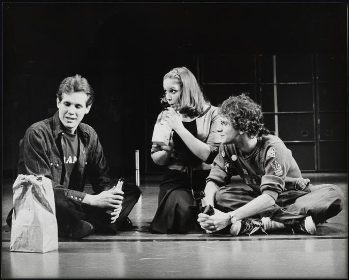[Jim Walton as Franklin Shepard, Sally Klein as Beth and Lonny Price as Charley Kringas in "Merrily We Roll Along".]