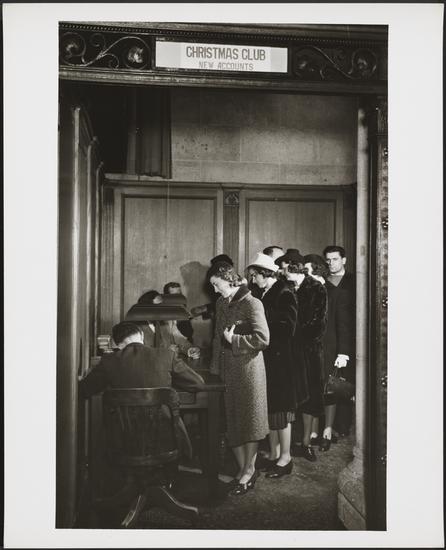 74 Wall Street. Seamen's Bank for Savings, flashlight views of depositors cashing Christmas Club checks, also opening new accounts for 1940.