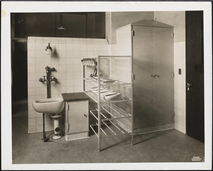 First Avenue between East 26th Street and East 30th Street. Bellevue Hospital. Interior with metal cabinets