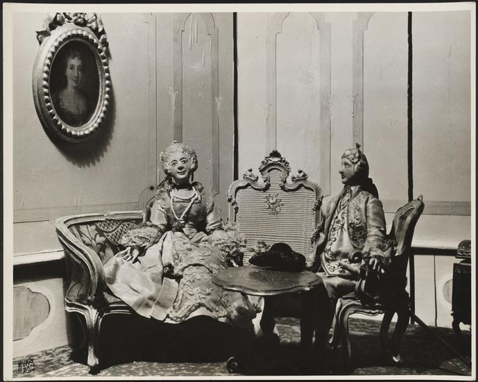 Group of view at Cooper Union Museum, puppets and marionettes on exhibition; close-ups of puppets; shadow pictures, etc.; general views of groups