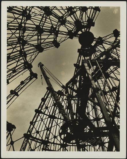 [New York World's Fair. Construction view, looking up at steel frame.]