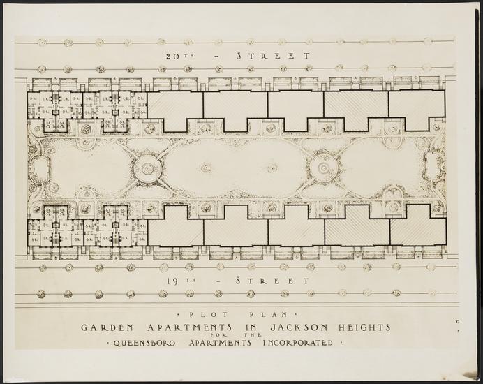 Jackson Heights apartments. Rendering, 1921, court gardens in rear of garden apartments.