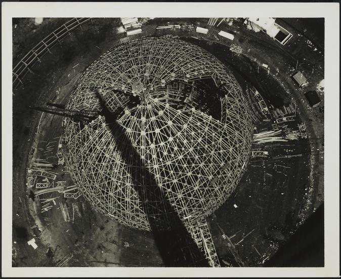 [New York World's Fair. Blimp flying over Perisphere and Trylon. Construction view.]