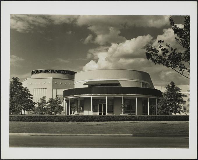 [New York World's Fair Administration building with "Mithrana" sculpture.]