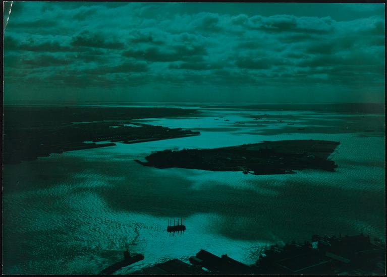 View from Cities Service tower, 60 Wall, looking south, [showing] New York Harbor, Governor's Island.