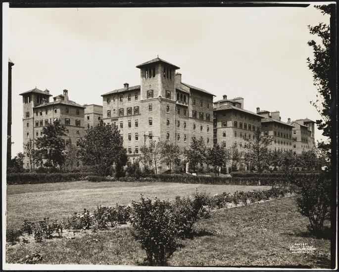 Tower Apartments. Garden centerpiece and gateway with griffins