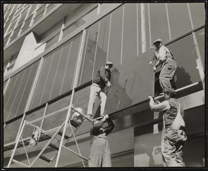 Park Avenue and 53rd Street. Lever Building [Lever House], Putting in Last Pieces of Glass in Courtyard