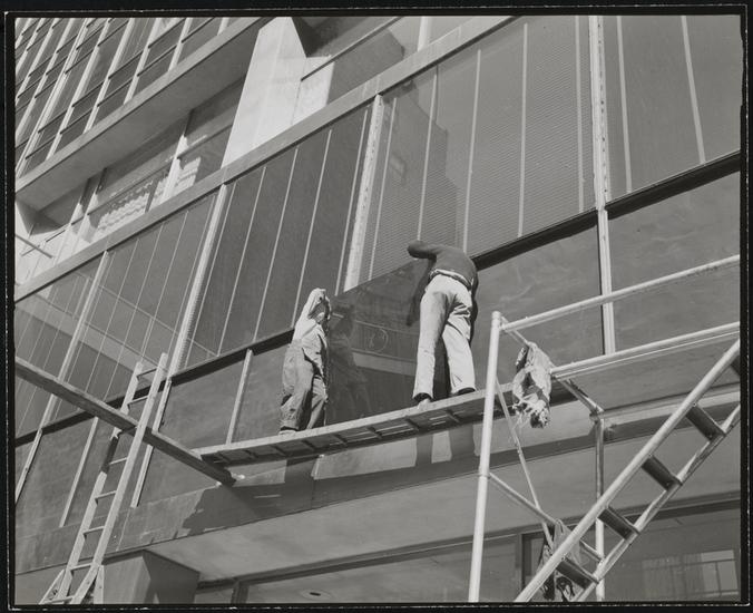 390 Park Avenue. Lever House. Men putting in last pieces of glass in courtyard