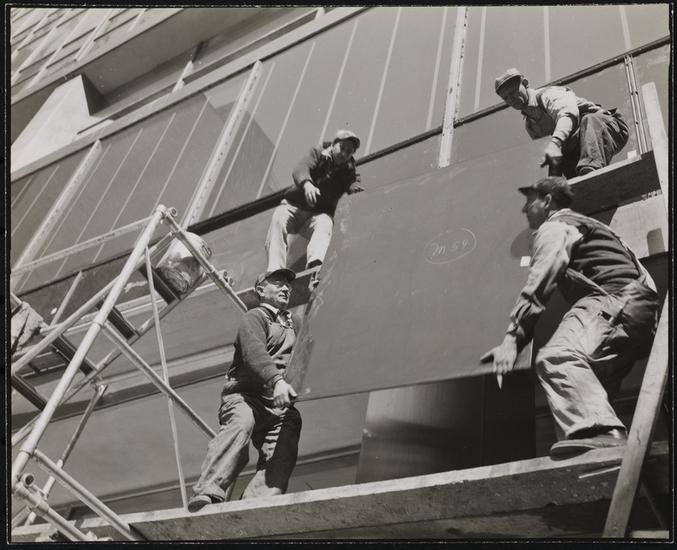 390 Park Avenue. Lever House. Men putting in last pieces of glass in courtyard