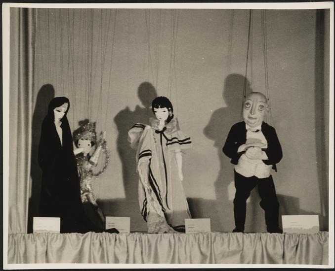 Group of view at Cooper Union Museum, puppets and marionettes on exhibition; close-ups of puppets; shadow pictures, etc.; general views of groups