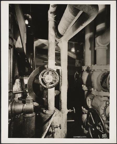 29th Street pier. S.S. Mobile City ship, Isthmian Line. Sump pump pipes