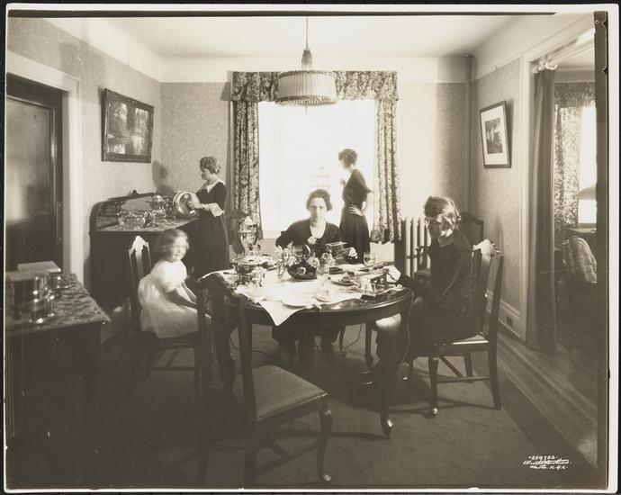 [Hawthorne Court. Apartment buildings and tea room with people dining outdoors.]