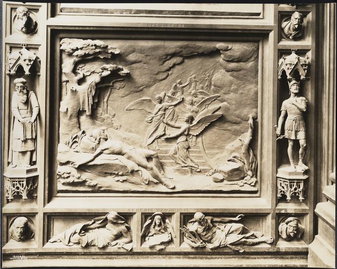 Wall Street and Broadway. Trinity Church. Sculptured architrave over main entrance