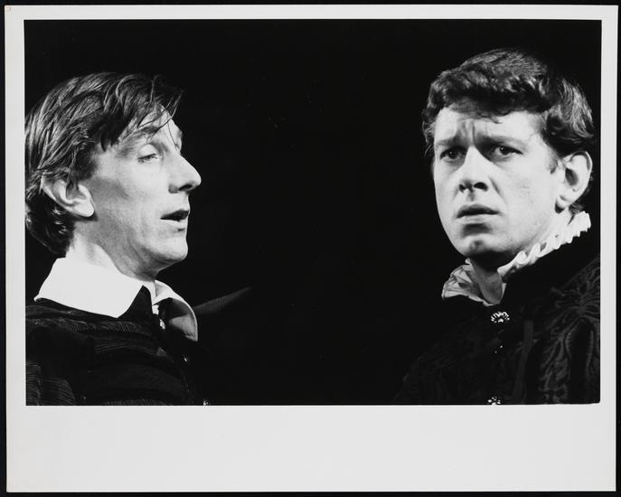 [Brian Murray as Rosencrantz, Noel Craig as Hamlet and John Wood as Guildenstern in "Rosencrantz and Guildenstern Are Dead".]