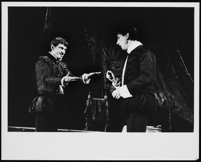 [Brian Murray as Rosencrantz, Noel Craig as Hamlet and John Wood as Guildenstern in "Rosencrantz and Guildenstern Are Dead".]