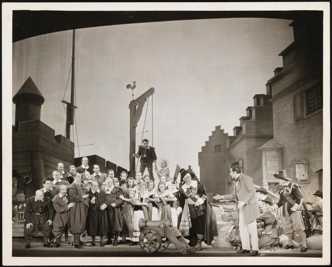[Ray Middleton as Washington Irving with Citizens of New Amsterdam in "Knickerbocker Holiday".]