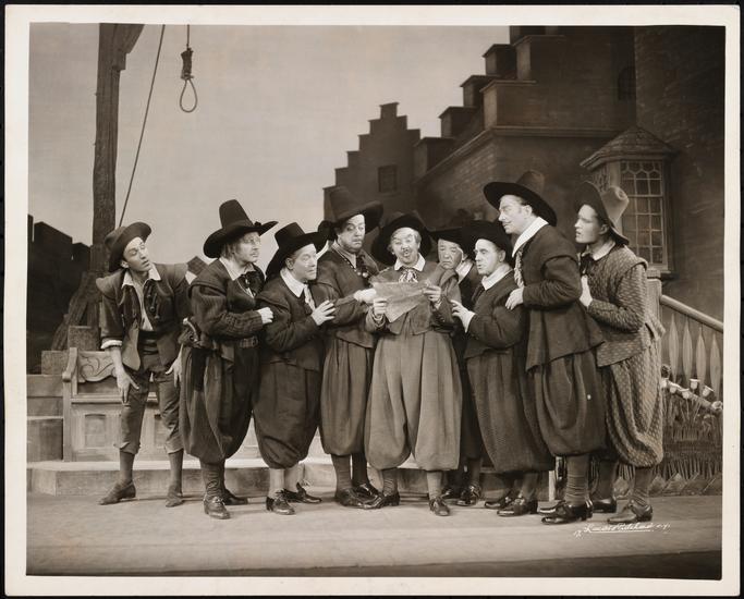 [Ray Middleton as Washington Irving with Citizens of New Amsterdam in "Knickerbocker Holiday".]