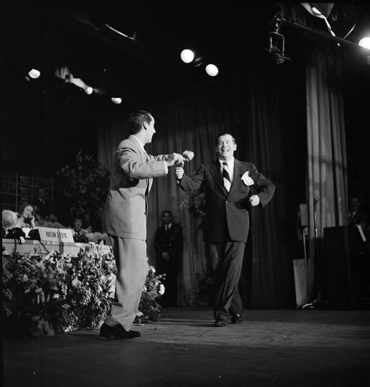 Milton Berle - Damon Runyon Cancer Fund [Milton Berle and another man singing at the telethon.]