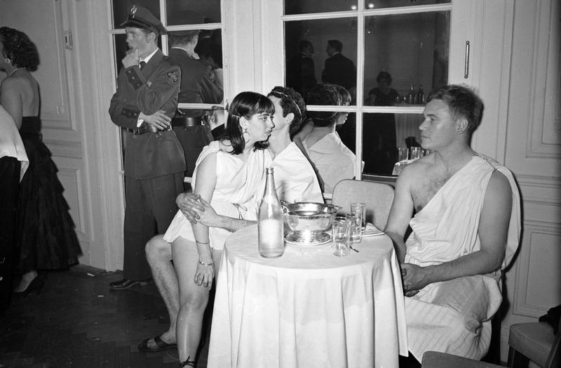 Art Students League Ball [Woman sitting on a man's lap at a table as a police officer looks away.]