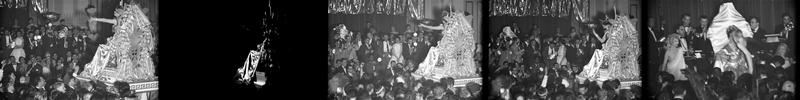 Art Students League Ball [Woman in a swan costume and Deborah Kerr entering the party on litters and the crowd at the party.]