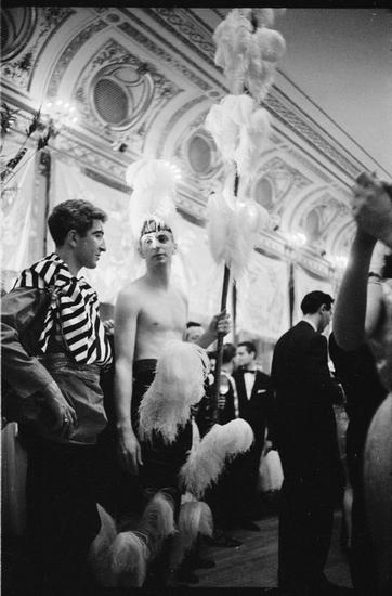 Art Students League Ball [Costumed man walking past men in tuxedoes.]