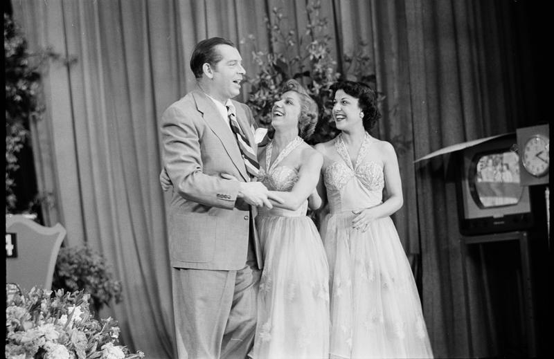 Milton Berle - Damon Runyon Cancer Fund [Milton Berle with two women at the telethon.]